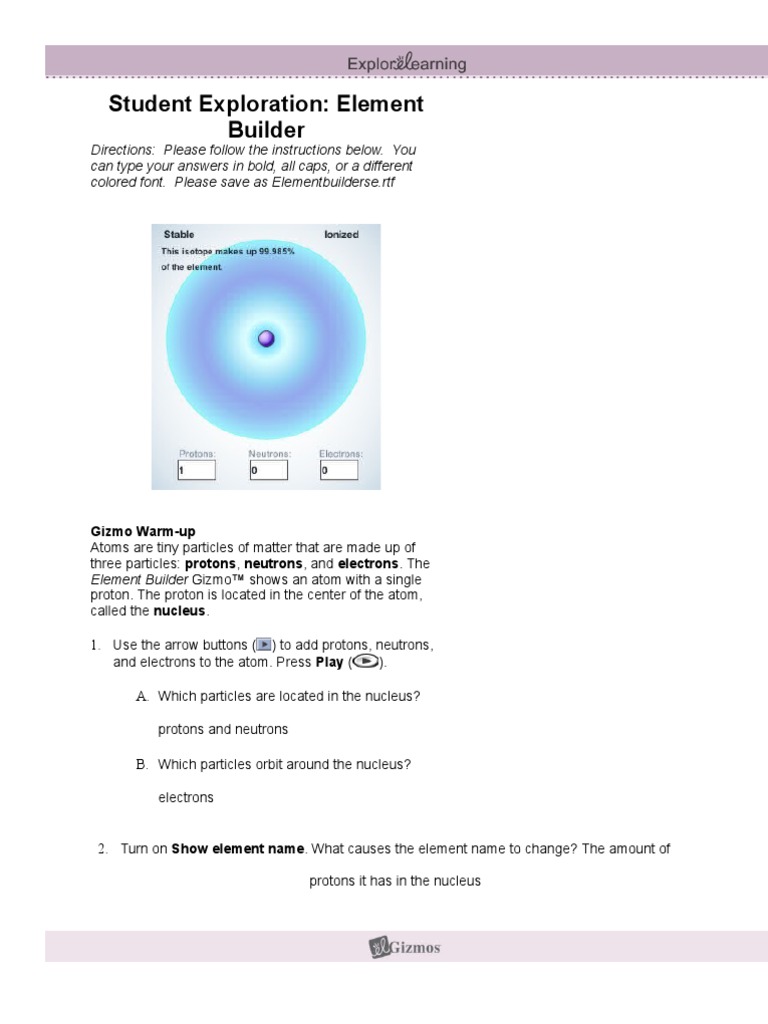 The gizmo element builder answer key that we provide for you will be ultimate to give preference. Element builder gizmo lab part 1 instructions. There is a faster way to do it than building all of the. Element builder gizmo activity a answer key element builder gizmo activity a answer key before gathering up her work and jacket, she carted the german porcelain cup to the miniature kitchen in the back. (more)h them access to all gizmo lesson materials, including answer keys. Follow report log in to add a comment answer 1.0 /5 4. Create a circuit with a battery multiple circuits can be built for comparison. How did the ph level and the water components level change after adding water to the battery acid? Atoms, if you know your periodic table). Lydianr96 +5 jd3sp4o0y and 5 others learned from this answer i tried to find them and i created a teacher account. This is a straightforward 1 page worksheet to introduce my grade 9 applied students to. The proton is located in the center of the atom, called the nucleus. >>>go to explorelearning.com and open the element builder gizmo.
